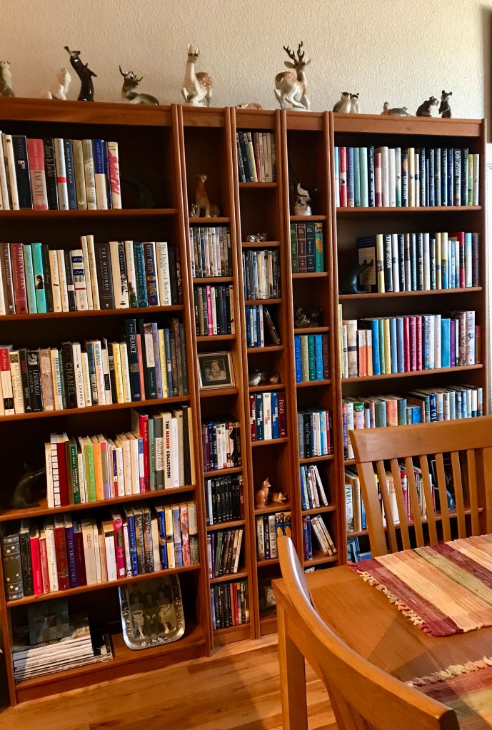 I recently came across the French word, bibliotheque (library). In a home, a library is not the same as shelves of books. One might see shelves as simply a place to store books. They become a library when they reflect who you are. I have books shelved in our dining area. Unconsciously, I may have chosen this location because, for me, reading is as important as eating. In placing bookshelves in a very public area of our home, I don’t know that I gave much thought to the statement those books make.