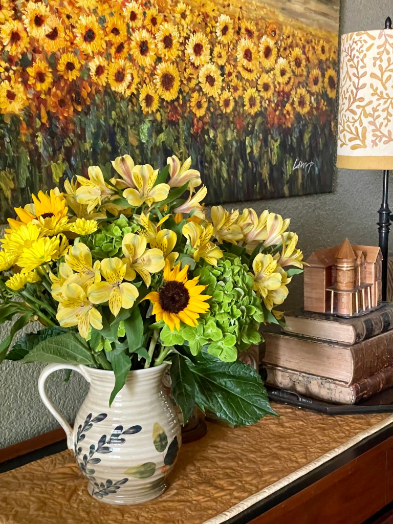 I have written about my unease in this post pandemic life and about my love of flowers. This vase of summer flowers, beneath a painting of a field of sunflowers in Provence, helps to provide me with peace in an increasingly fraught society. When we are surrounded by a world of disorder and confusion outside, what we enclose ourselves with at home can be our salvation. Turn off television news, log out of your computer, turn off your phone, and escape from all the negativity. Yes, we have a responsibility to make the world a better place, to stand up for what is right. We can’t do that by losing our soul in the process. We need to recognize what is out of our purview and stop obsessing over it.