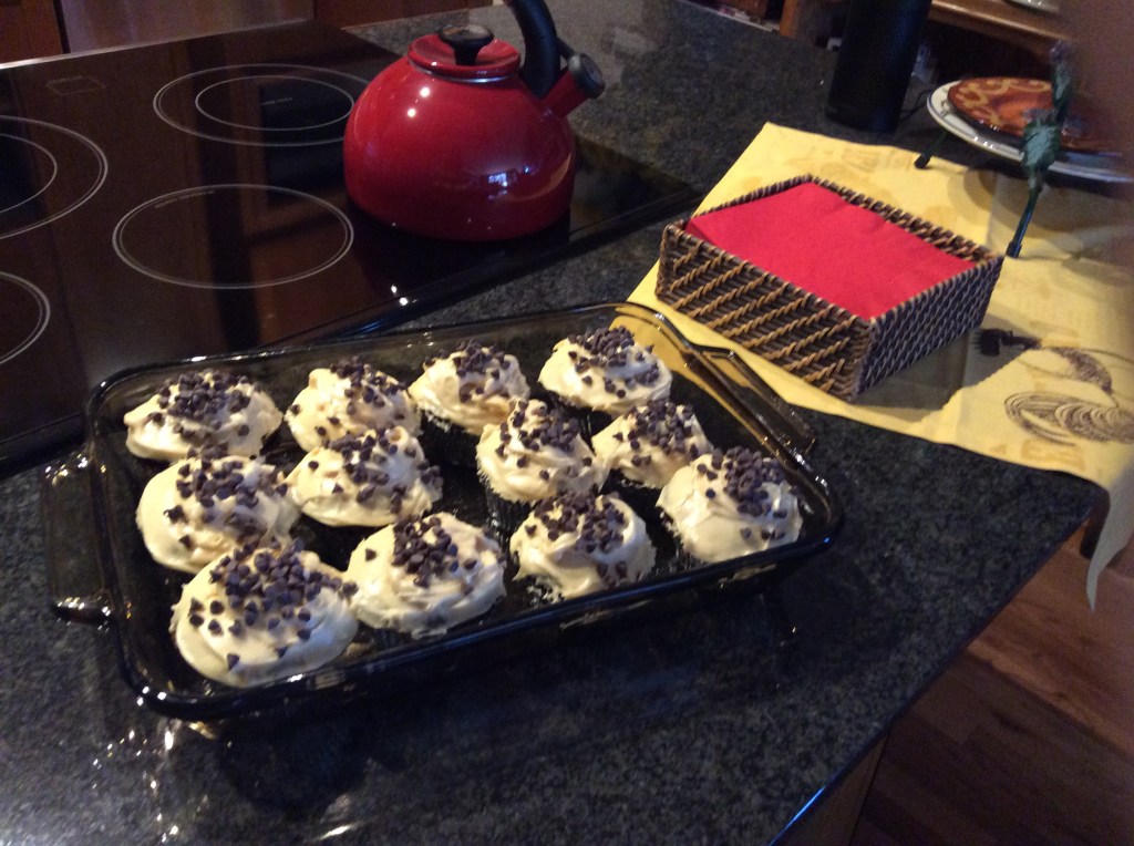 A family Fourth of July table. Demitasse for a European feel. Ann Estelle, dressed for March, looking down from the side of refrigerator. Cupcakes made during one of my rare moods to bake something. Postcards from art exhibits I’ve been to, hung from a string. This is all part of our home.